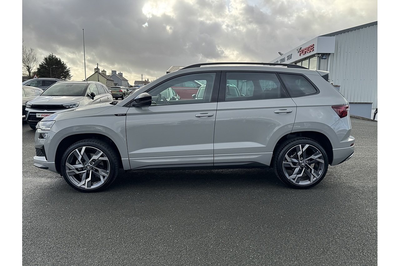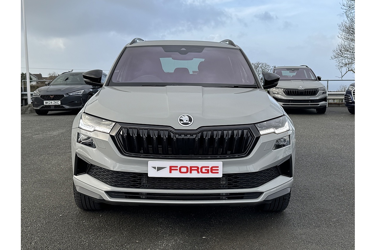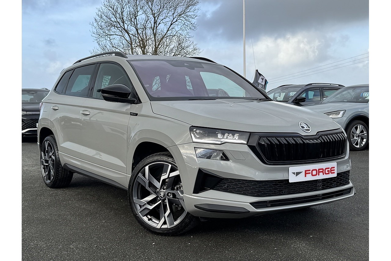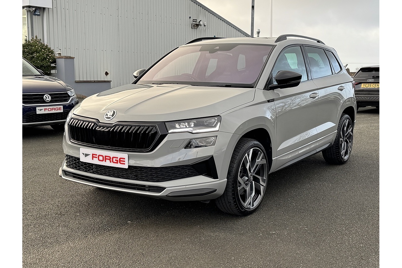 Here at Forge Garage we have this stunning Meteor Grey 2025 Skoda Karoq SportLine Edition with only 8,289 Miles on the clock. This 2025 Škoda Karoq TSI SportLine Edition with a 1.5‑litre petrol engine and DSG transmission is a stylish and capable compact SUV that balances everyday practicality with dynamic character. Its 150 ps turbocharged engine, featuring Active Cylinder Technology for improved efficiency, delivers lively performance and smooth power delivery, while the DSG automatic gearbox offers effortless gear changes that suit both urban cruising and motorway driving. The SportLine Edition adds a sporty edge with distinctive exterior styling, sport seats, 19‑inch alloy wheels, and modern features like Matrix LED headlights and a panoramic glass roof that elevate the overall presence and comfort. Inside, the cabin is spacious and well‑equipped, providing generous luggage capacity and connectivity to support both daily use and longer journeys. With its blend of sharp design, efficient performance, and versatile practicality, the 2025 Karoq SportLine Edition makes a compelling choice in the compact SUV segment.