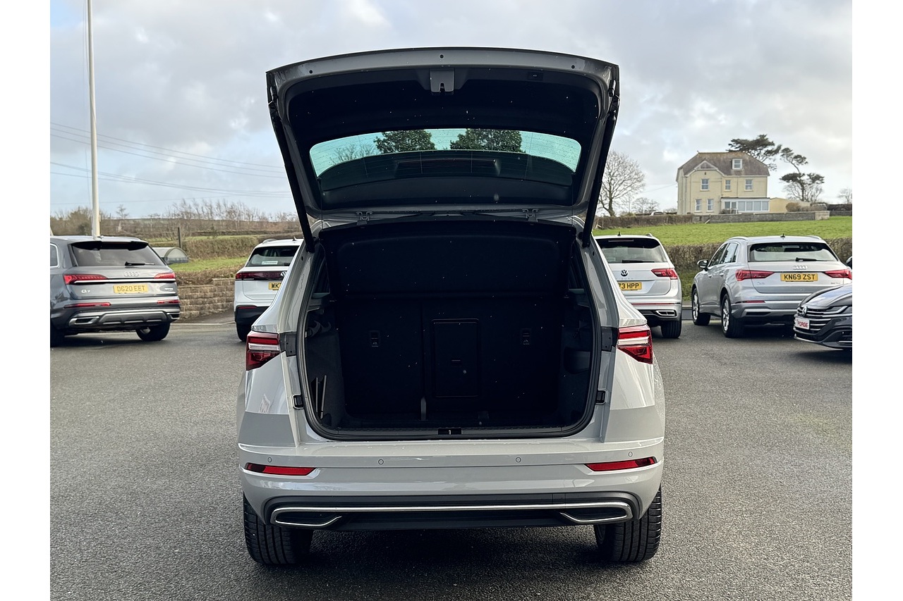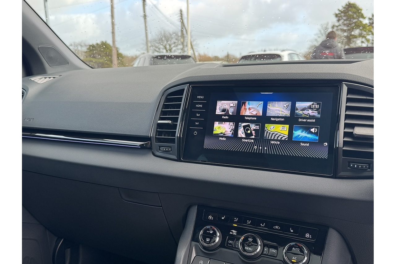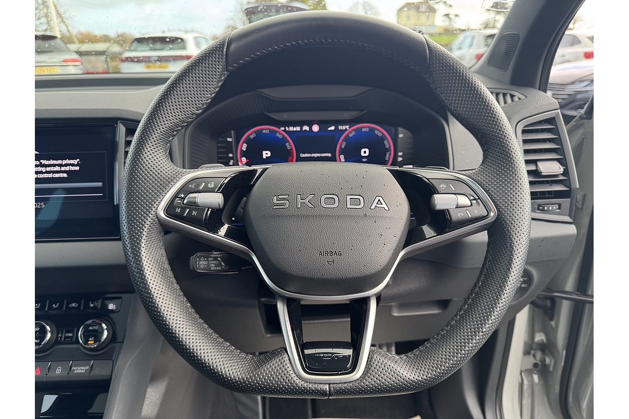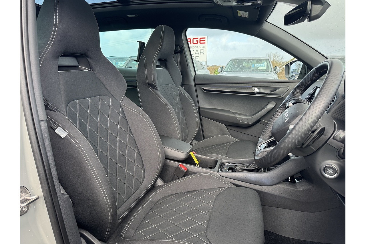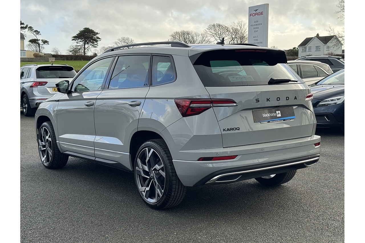 Here at Forge Garage we have this stunning Meteor Grey 2025 Skoda Karoq SportLine Edition with only 8,289 Miles on the clock. This 2025 Škoda Karoq TSI SportLine Edition with a 1.5‑litre petrol engine and DSG transmission is a stylish and capable compact SUV that balances everyday practicality with dynamic character. Its 150 ps turbocharged engine, featuring Active Cylinder Technology for improved efficiency, delivers lively performance and smooth power delivery, while the DSG automatic gearbox offers effortless gear changes that suit both urban cruising and motorway driving. The SportLine Edition adds a sporty edge with distinctive exterior styling, sport seats, 19‑inch alloy wheels, and modern features like Matrix LED headlights and a panoramic glass roof that elevate the overall presence and comfort. Inside, the cabin is spacious and well‑equipped, providing generous luggage capacity and connectivity to support both daily use and longer journeys. With its blend of sharp design, efficient performance, and versatile practicality, the 2025 Karoq SportLine Edition makes a compelling choice in the compact SUV segment.