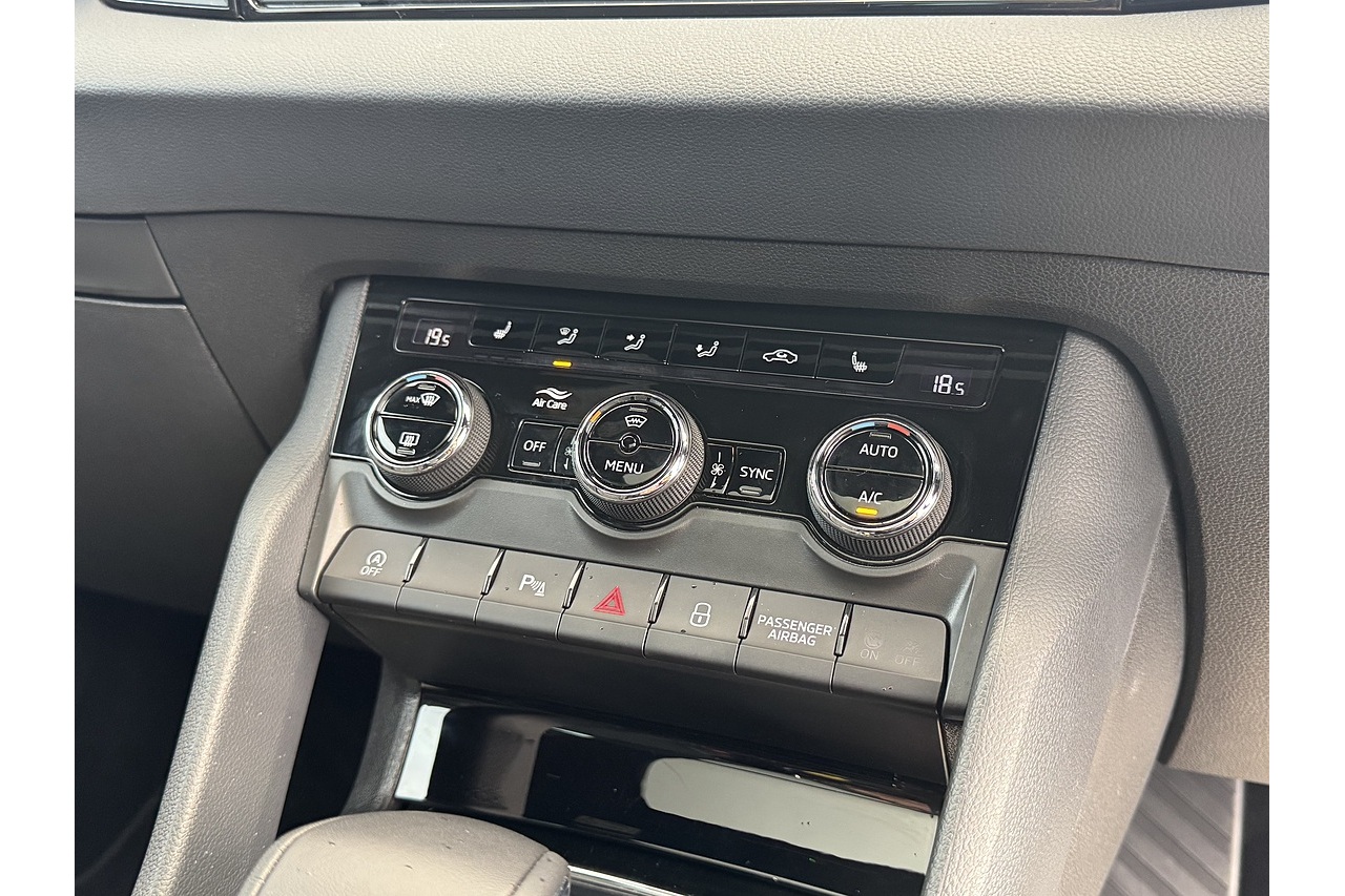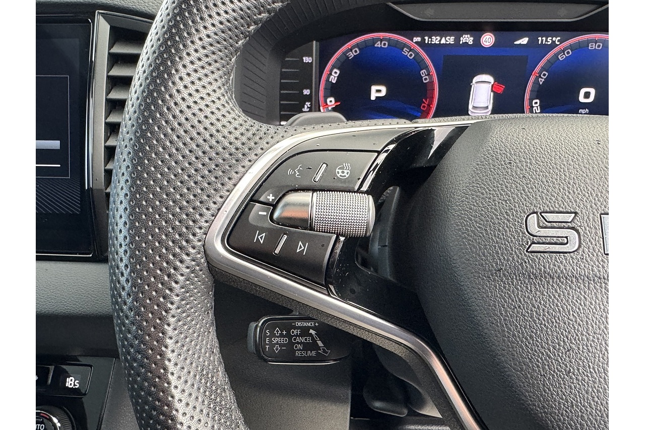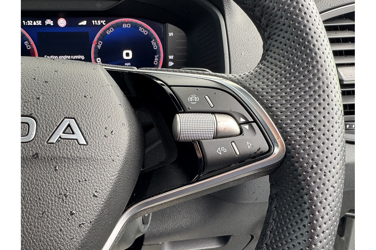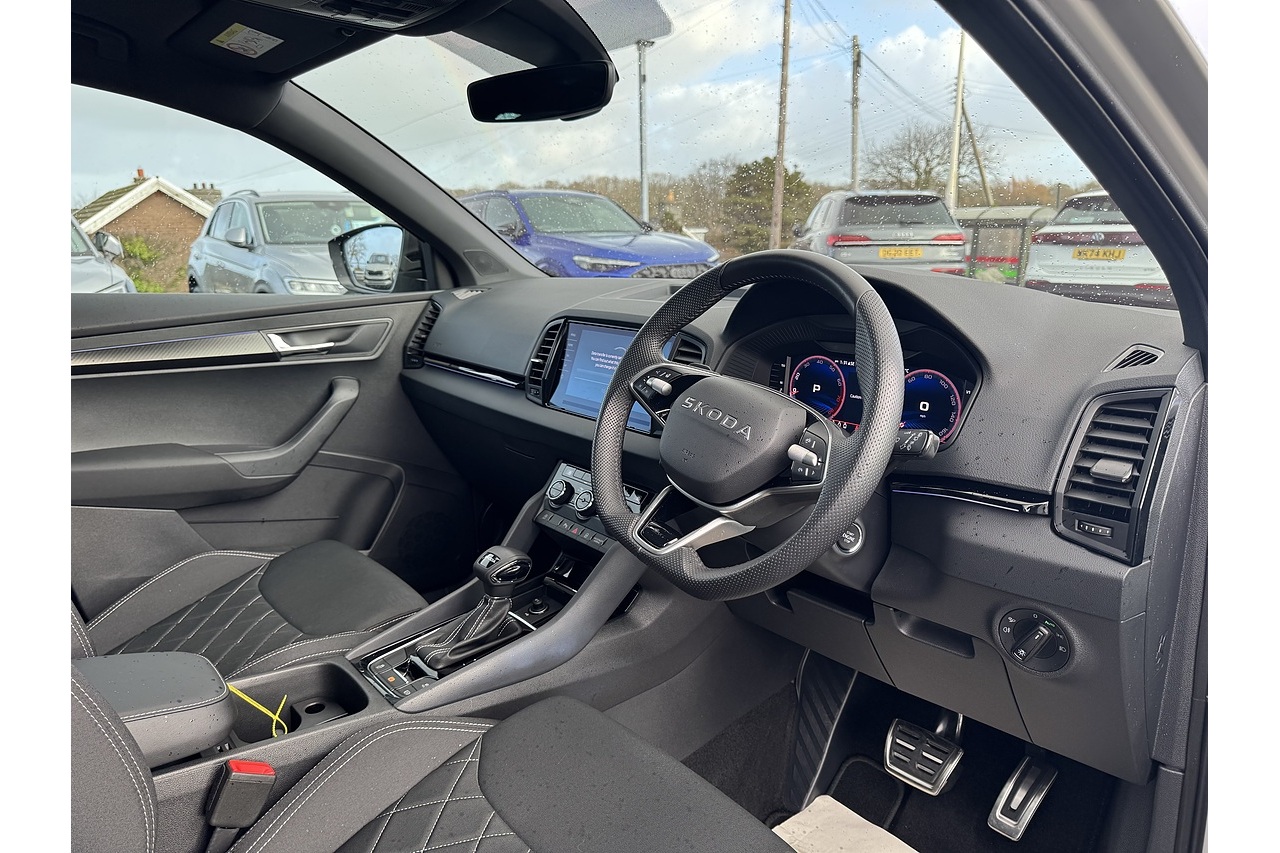 Here at Forge Garage we have this stunning Meteor Grey 2025 Skoda Karoq SportLine Edition with only 8,289 Miles on the clock. This 2025 Škoda Karoq TSI SportLine Edition with a 1.5‑litre petrol engine and DSG transmission is a stylish and capable compact SUV that balances everyday practicality with dynamic character. Its 150 ps turbocharged engine, featuring Active Cylinder Technology for improved efficiency, delivers lively performance and smooth power delivery, while the DSG automatic gearbox offers effortless gear changes that suit both urban cruising and motorway driving. The SportLine Edition adds a sporty edge with distinctive exterior styling, sport seats, 19‑inch alloy wheels, and modern features like Matrix LED headlights and a panoramic glass roof that elevate the overall presence and comfort. Inside, the cabin is spacious and well‑equipped, providing generous luggage capacity and connectivity to support both daily use and longer journeys. With its blend of sharp design, efficient performance, and versatile practicality, the 2025 Karoq SportLine Edition makes a compelling choice in the compact SUV segment.